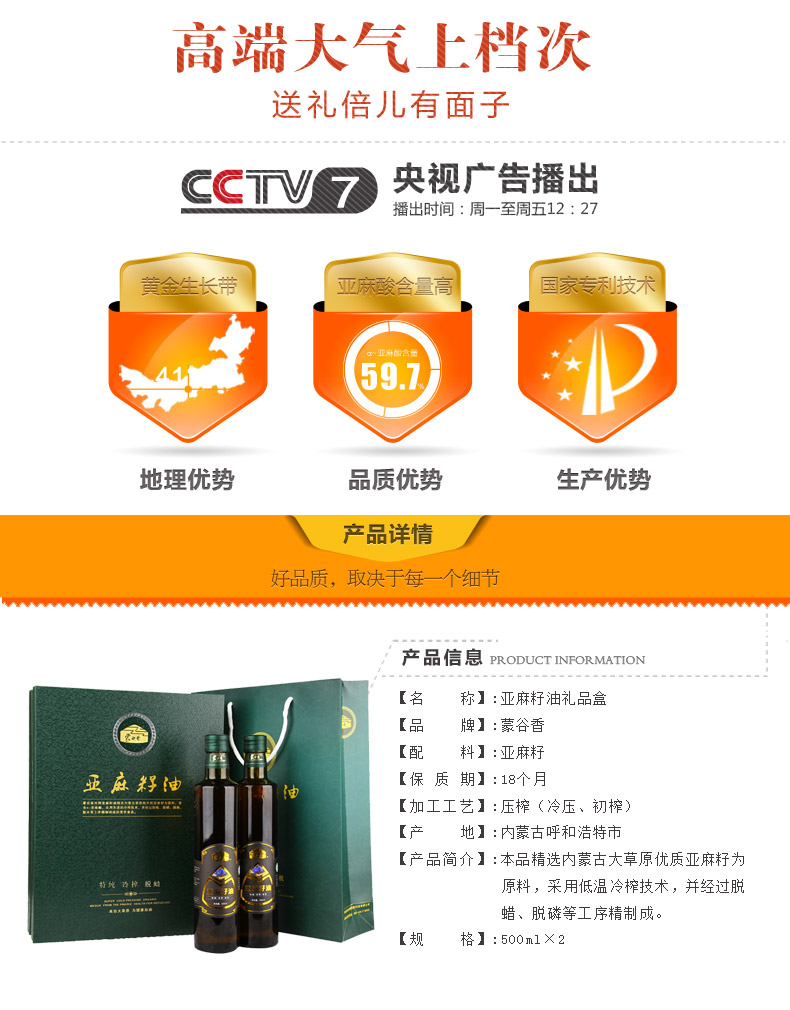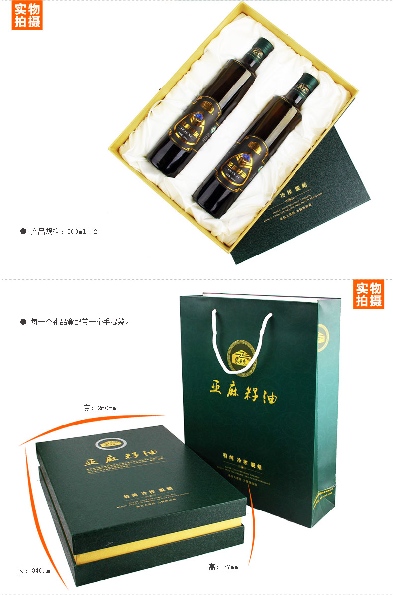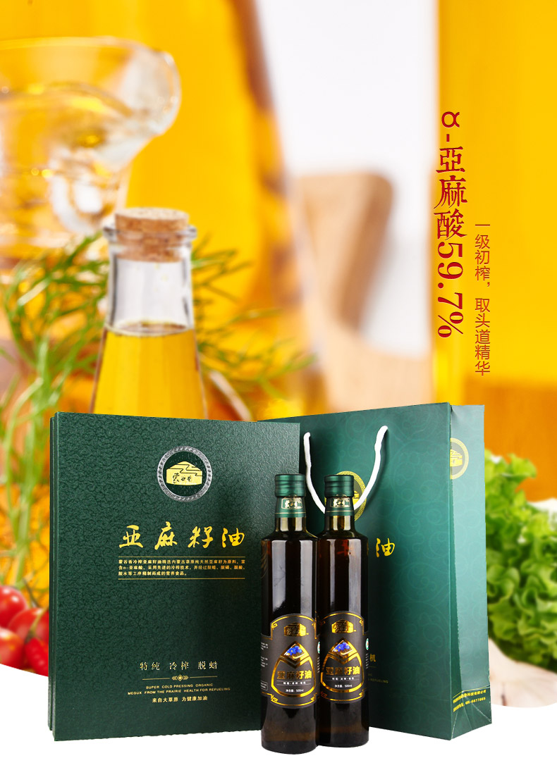 蒙谷香亚麻籽油500ML*2礼盒装 冷榨初榨脱蜡内蒙古食用油