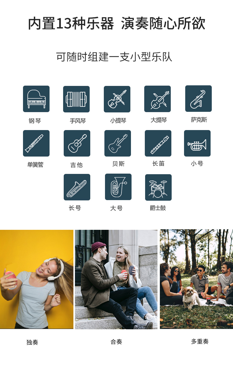 个头小,方便携带,可随手弹奏各类乐曲。可多人组成乐队弹奏。