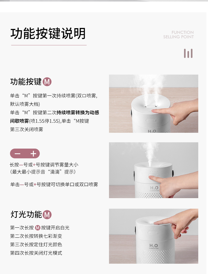 【注意事项】:这款产品是加湿器,材质跟结构不适合做香薰,如果加精油,可能会损坏产品的使用寿命。加湿器的水建议用自来水,因为蒸馏水经过蒸发,纯净水经过提取,改变了原有的水质,使用纯净水或者蒸馏水可能会出现湿桌面的现象。