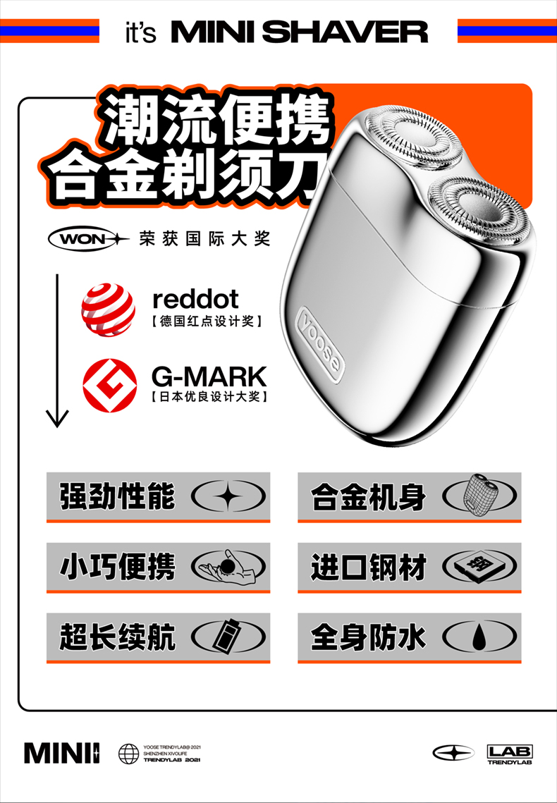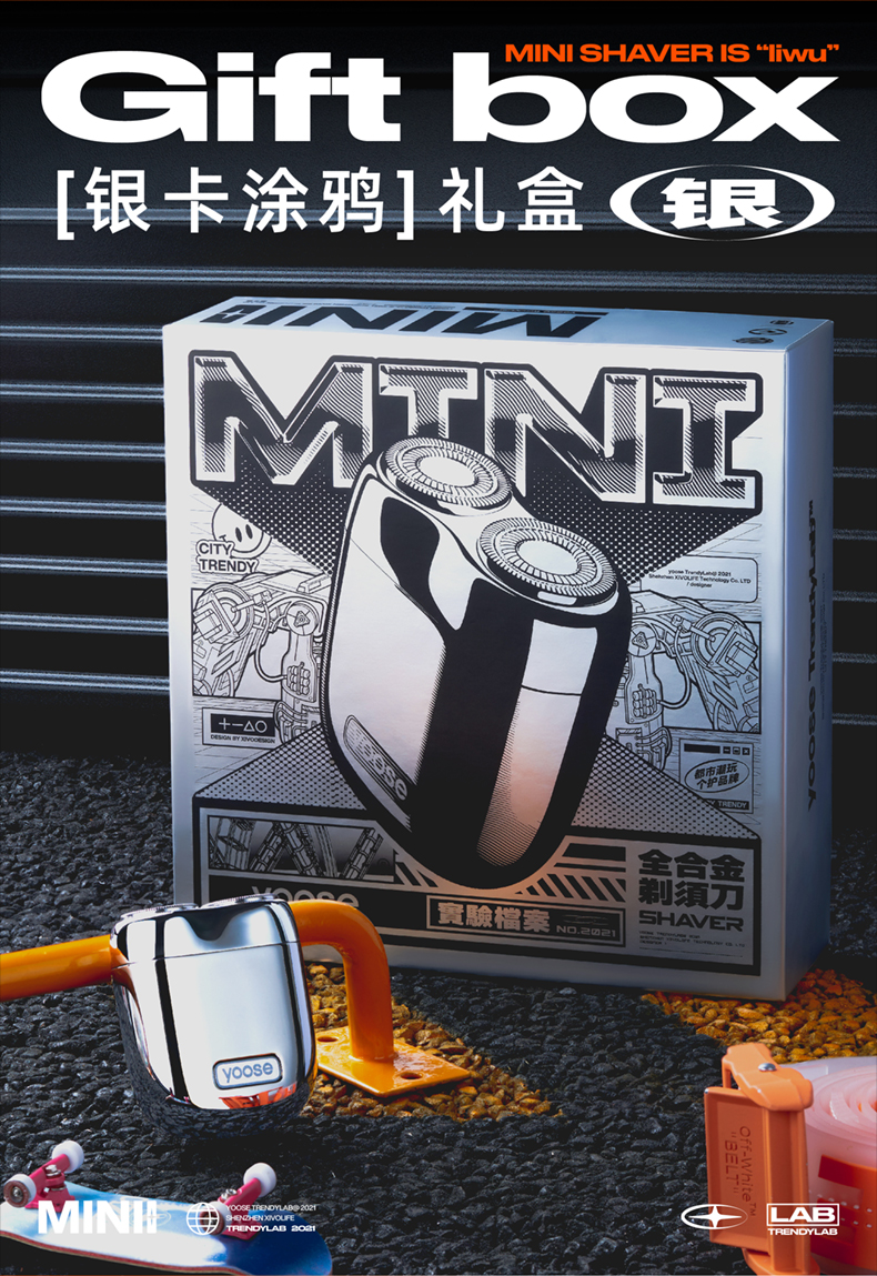 MINI: 电 池:360毫安 电池材质:高容量钴酸锂➕石墨 双环弧面刀网 电镀纸壳包装 充电接口:Tpye-C 续航时间:80分钟 充电时长:1小时 防水等级:ipx7级别 刀片材质:进口钢材 刀片工艺:动刀工艺 特殊技术:动力平衡减电不减动力 刀头设计:磁吸式耐高温 高效电机:7200转高速静音电机