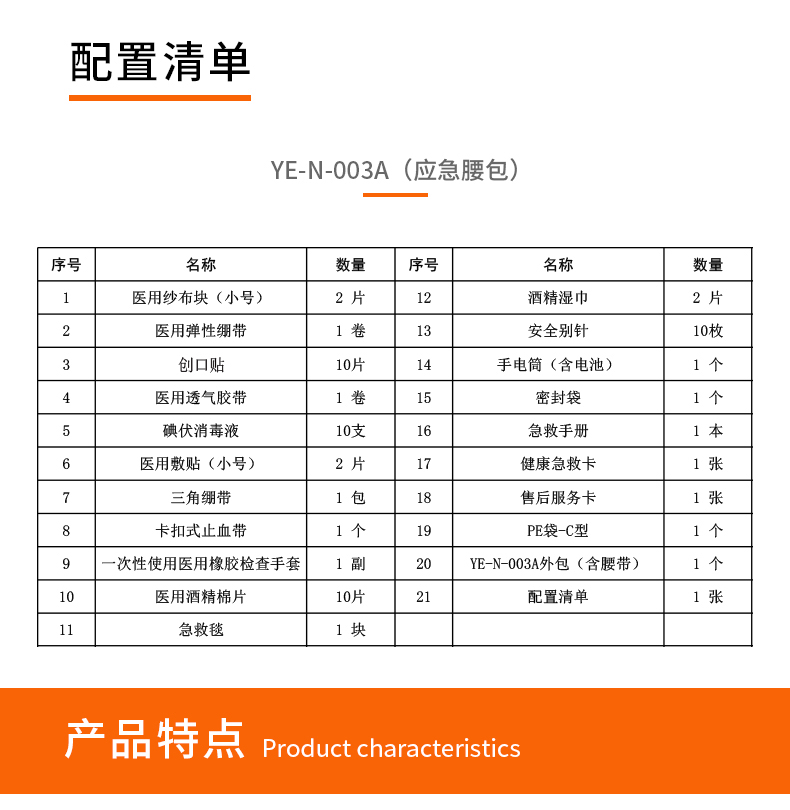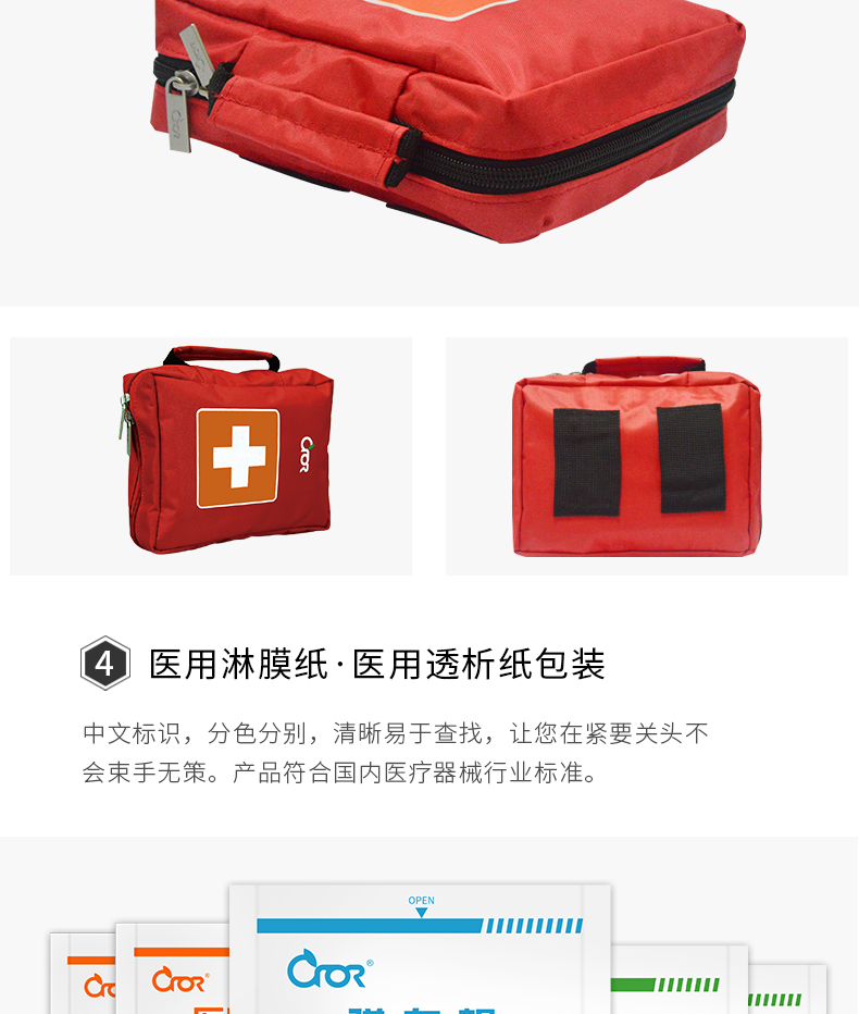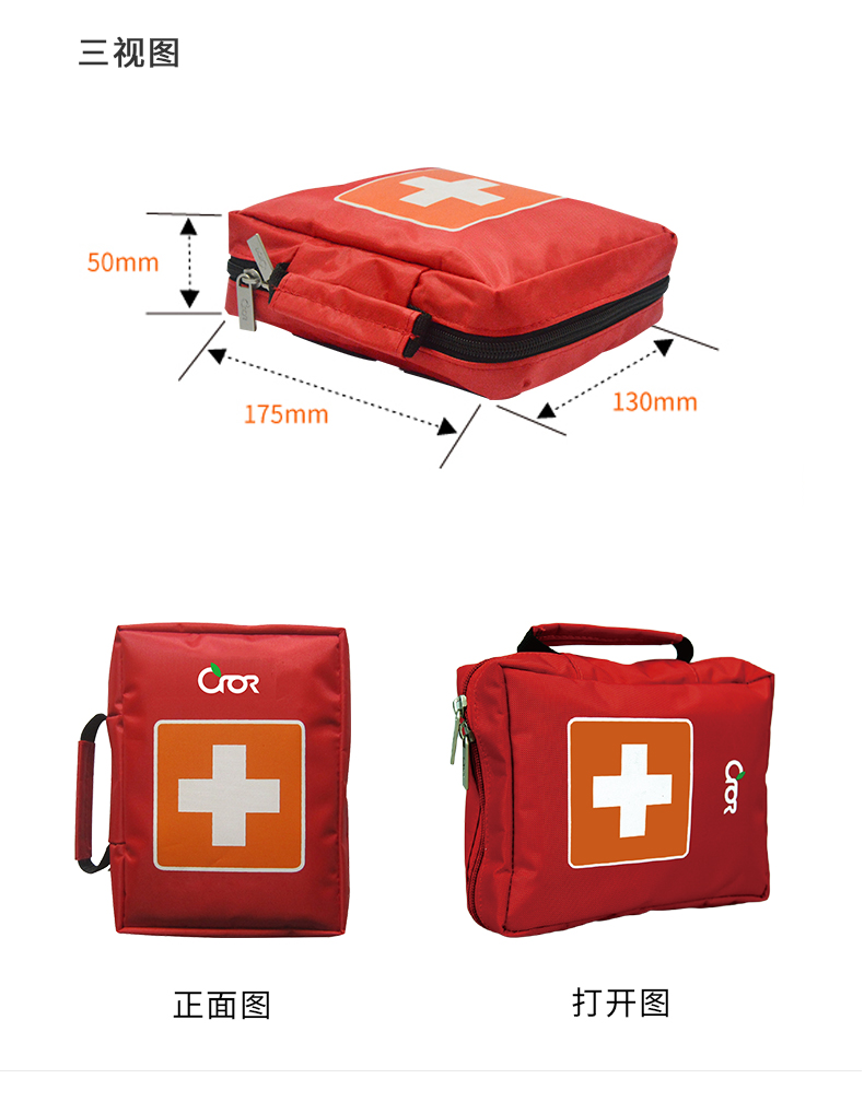野外工作中随身携带,内置清创消毒、止血包扎医疗用品,遇有意外状况,可以立即自救互救。携带方式多样化,便携附包设计,可附于背囊上,也可作腰包、手提包使用。迷彩、黑色及红色的外观设计更加贴合户外工作和户外运动的特性。