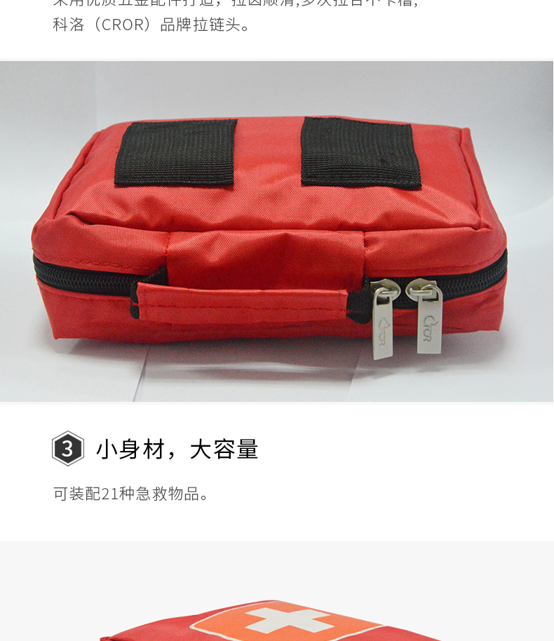 包体采用高强度防水牛津面料,耐磨,防撕裂,防水拉链设计,携带方式多样化,便携附包设计,可附于背囊上,也可作腰包、手提包使用。迷彩、黑色及红色的外观设计更加贴合户外工作和户外运动的特性。可供有野外工作任务的行业如:电网、通信、地质勘探、交通路桥、林业部门等为员工安全配备,作为野外勘探急救包、电力工作急救包、户外作业急救包使用。