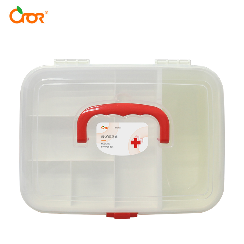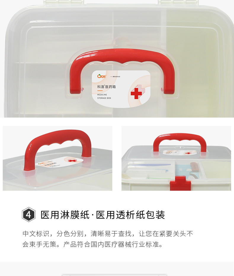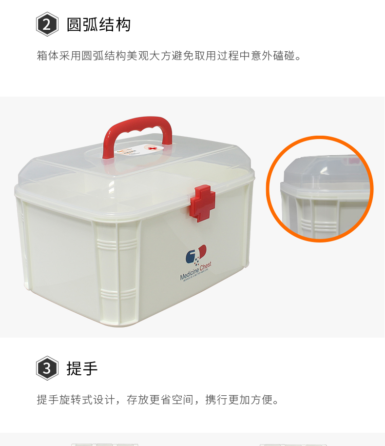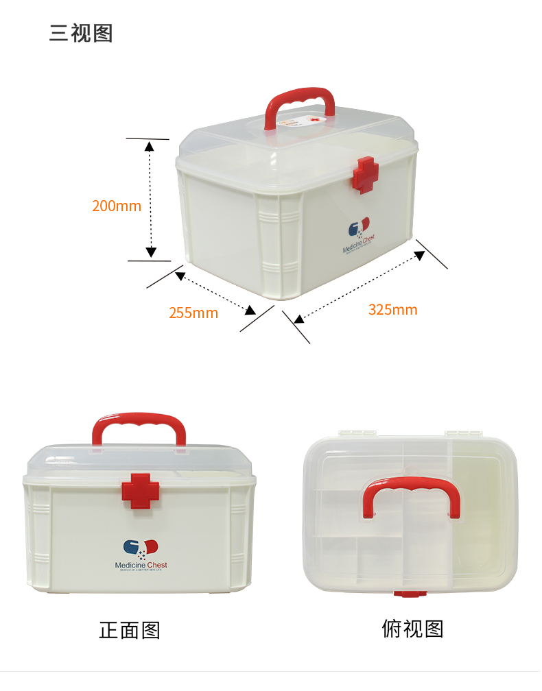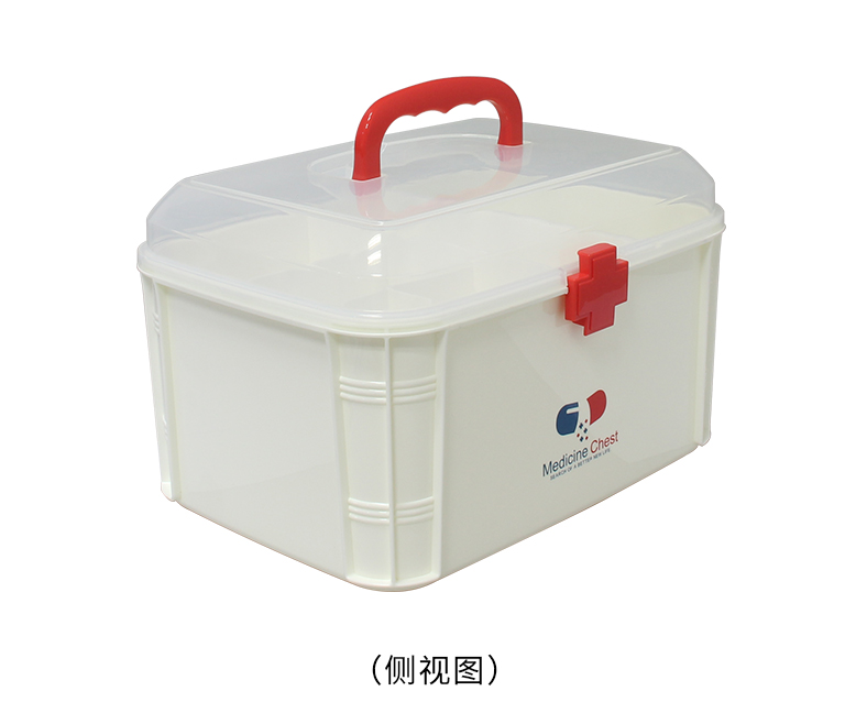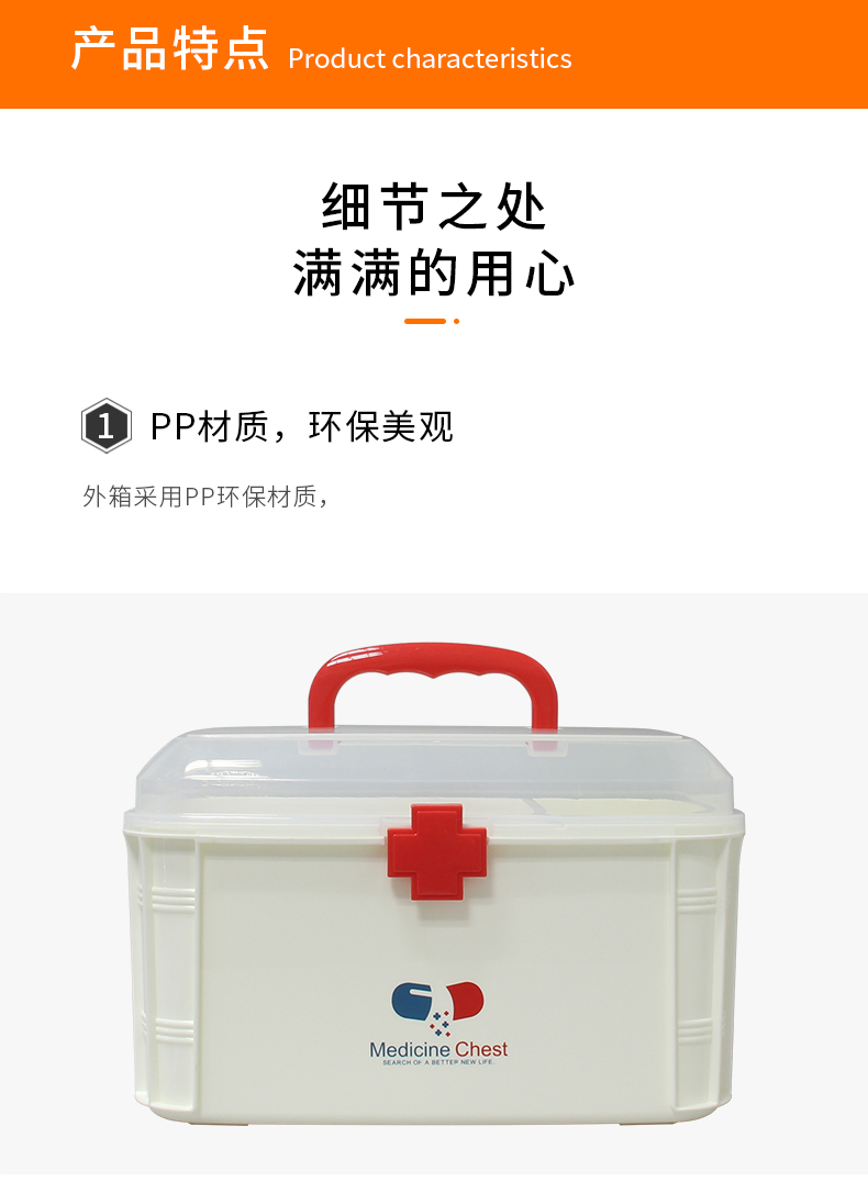 家庭药箱采用优质PP材质,健康环保,不易老化,具有防摔的特点;药箱采用多格浅盘式设计,方便放置小型盒装药品;药箱两侧设有密封扣,牢固、密封、防尘防潮,有效保护药品存放保质期内不受损坏。底部四角处防滑设计,四角三边加固,防滑且牢固。
