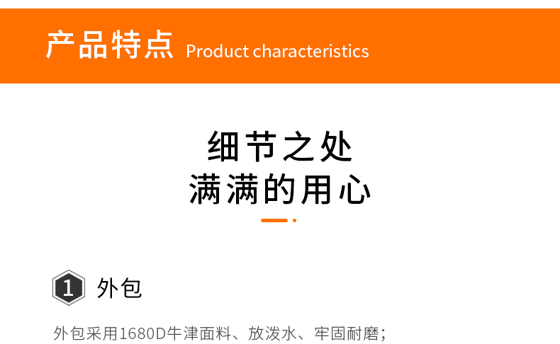 包材牛津面料制成,大方耐用、携带方便、分隔合理、配置齐全、取用便利。