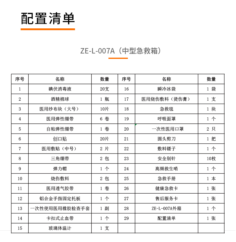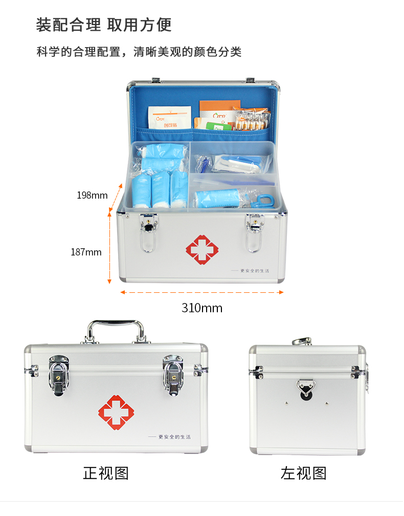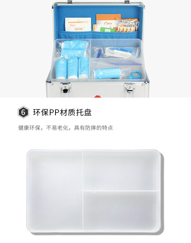 内容物设置科学,产品布局摆放合理、内包装清晰统一,取装方便,便于现场急救时快速取用。可作为办公室急救箱、家庭急救箱、工厂急救箱、校园急救箱使用。