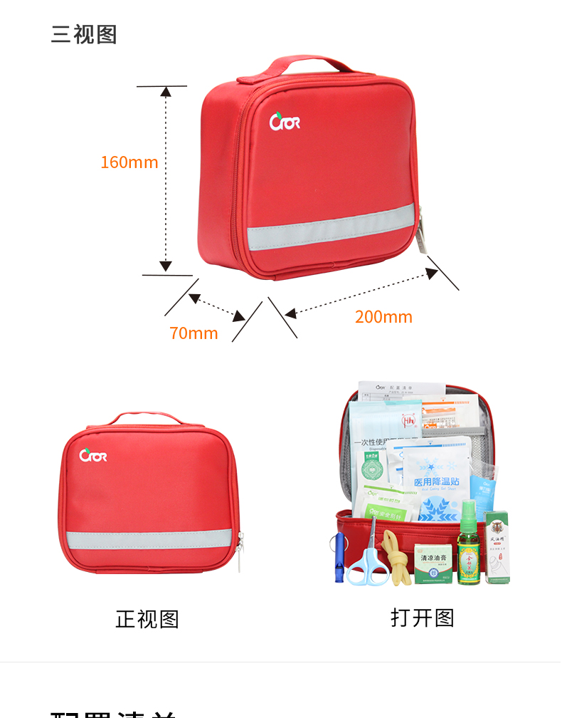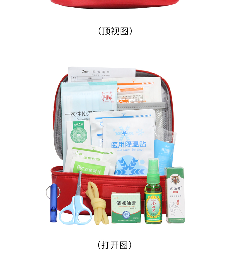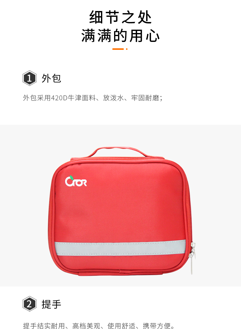 防泼水面料、包内分隔合理、内容物配置科学实用、内容物取用方便快捷。