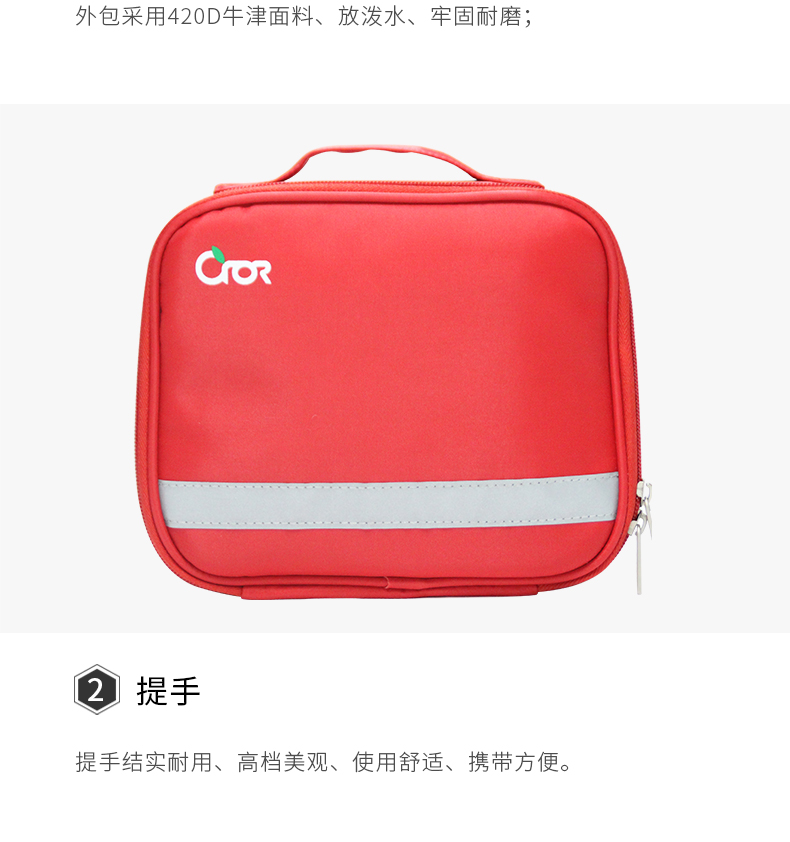 防泼水面料、包内分隔合理、内容物配置科学实用、内容物取用方便快捷。