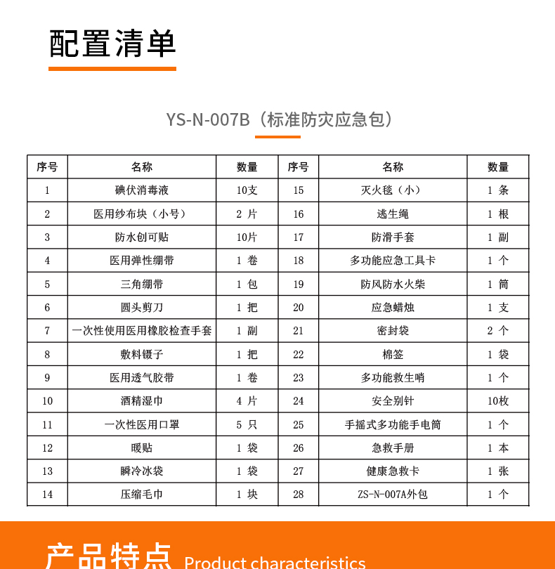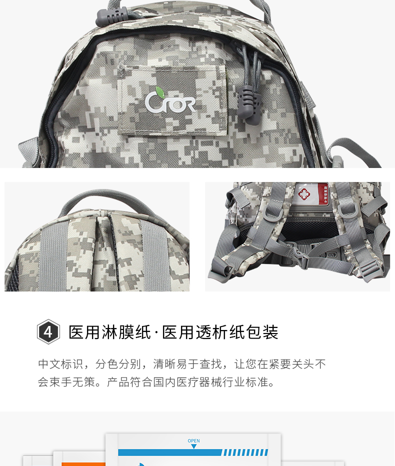 外包采用高强度牛津面料,有肩背、手提等多种携带方式。涵盖逃生、自救互救和求救的应急急救物品。当有灾害发生时能在第一时间逃生,并进行自救互救和求救,为每个家庭提供全方面的急救护理。外型美观大方,专业水准,使用方便。