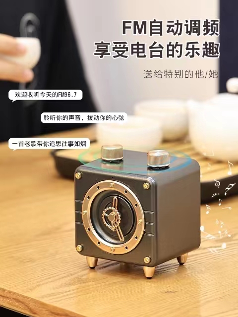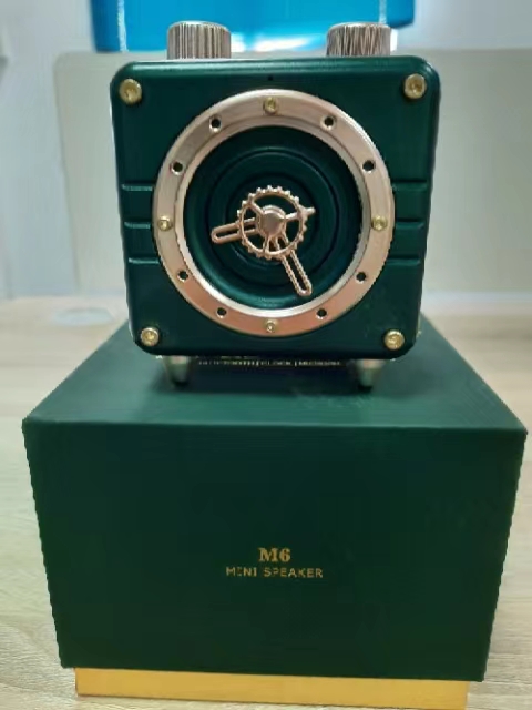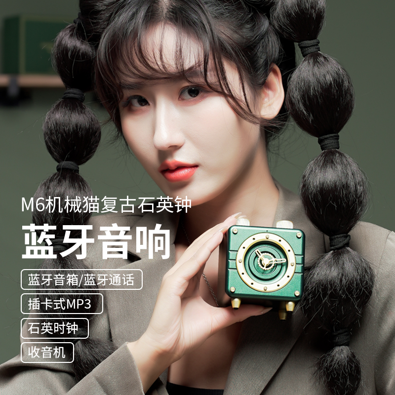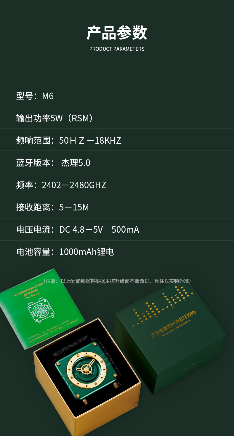 技术参数: 颜色:复古绿 / 钛金灰 材质:ABS 输出功率:5W 频率响应:40-18KHZ 扬声器阻抗:4Ω 产品等级:合格品 充电规格:5V/1A 电池容量:1000mAh 充电时间:约1小时 播放时间:约3-6小时 蓝牙方案及版本:杰理5.0 蓝牙范围:5-10米 产品功能: 蓝牙连接播放、TF卡扩展、快速充电、石英钟、FM收音包装规格:产品尺寸:80*67*94mm包装尺寸:129*129*100mm 整箱尺寸:615*270*415mm 净重:0.223kg,毛重:0.391kg,箱重:16.5kg.整箱数量:40台/箱