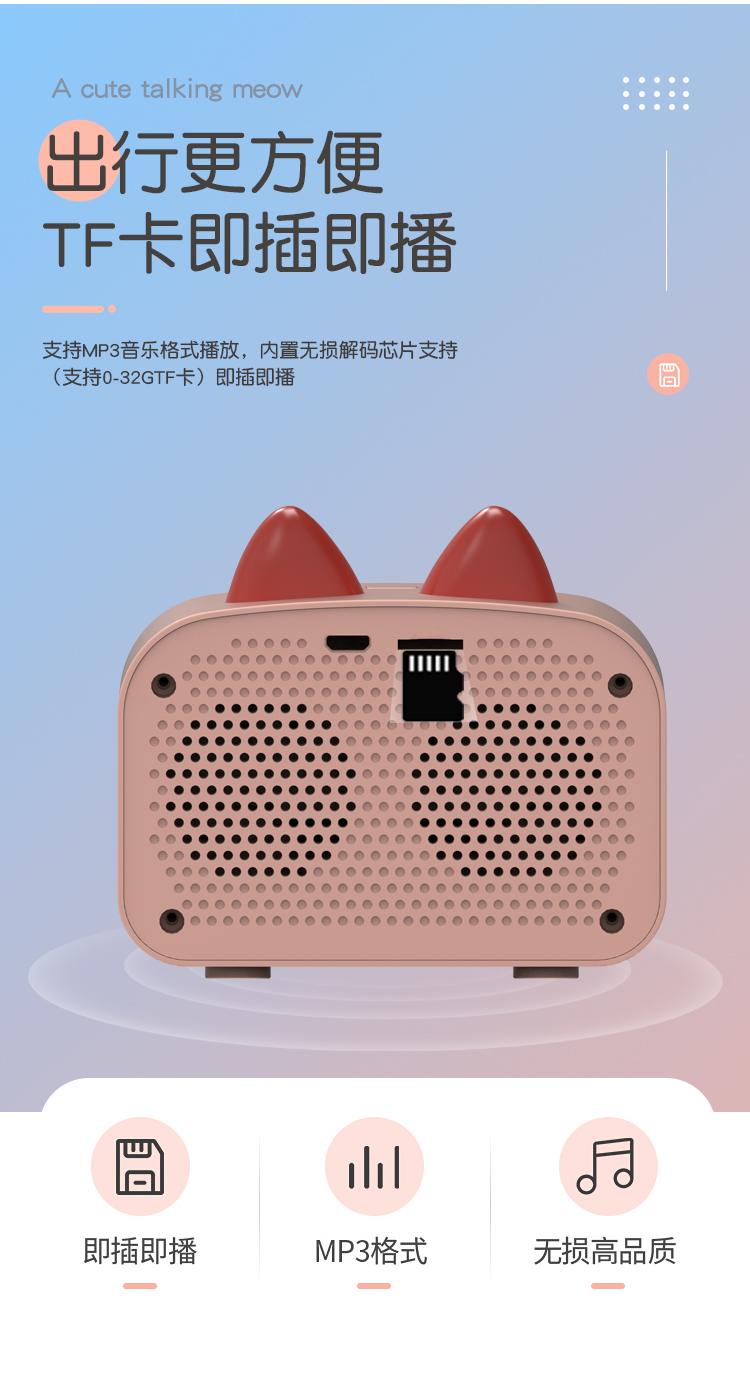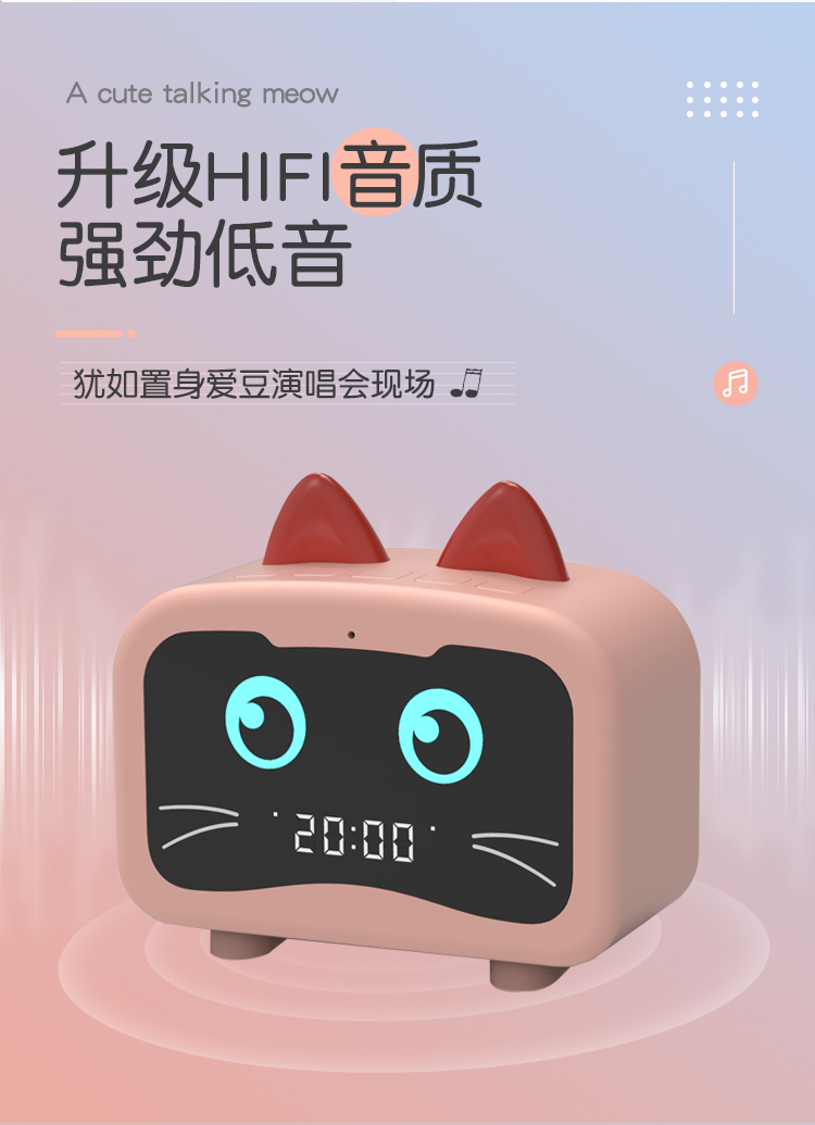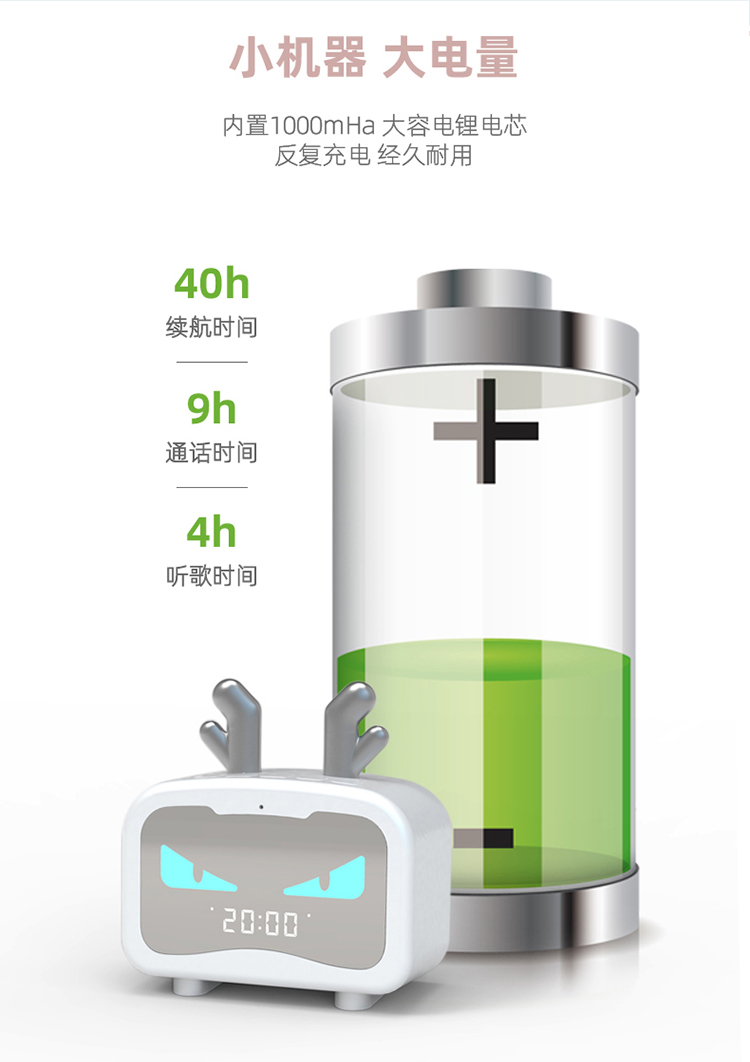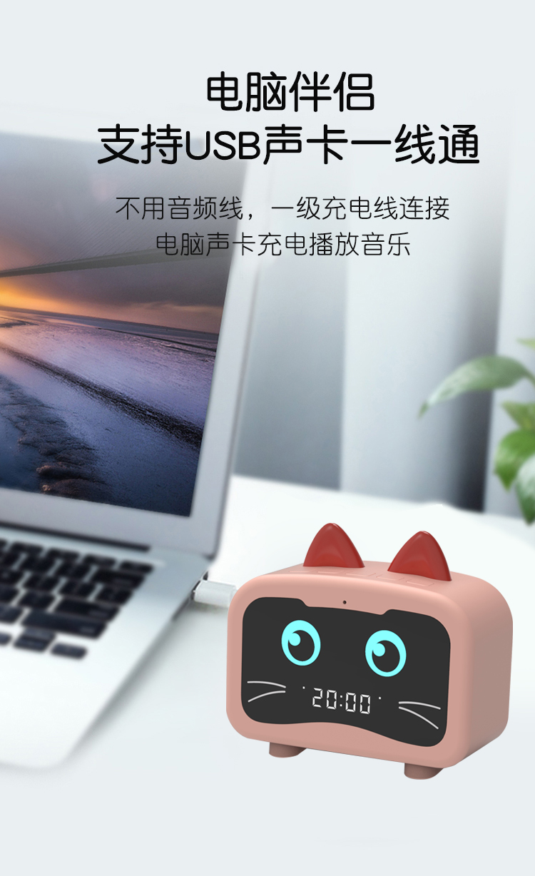 技术参数: 功率:3W 材质:ABS环保塑胶 电池容量:1000mHA 蓝牙版本:5.0蓝牙距离:5-15M 电压:DC 5V 阻抗:4欧 频率:2.402-2.48GHZ 产品特点 :LED时钟闹钟显示调节、蓝牙无线连接播放、FM收音自动调频、TF插卡包装规格: 产品尺寸:猫100*86*45mm 颜色:白/粉 产品尺寸:龙100*100*45mm 颜色:白/黑 产品包装尺寸:125*153*48 mm; 外箱尺寸:510*315*400mm 产品毛重: 0.26kg ; 产品净重:0.20kg 整箱重量: 16.5Kg; 整箱数量:60台/箱