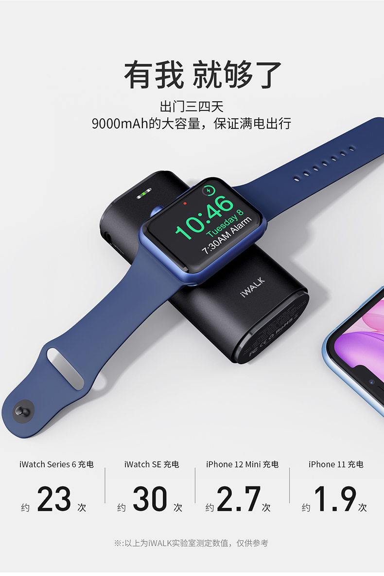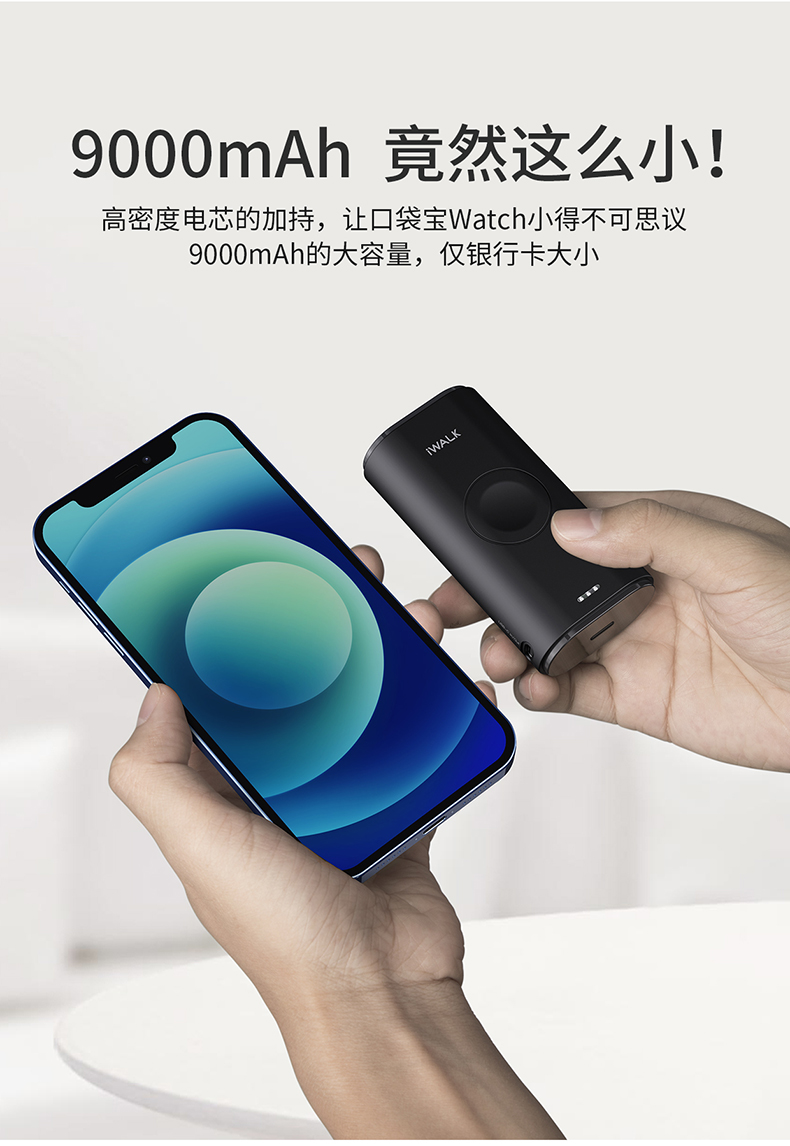 ・ 苹果手表,苹果手机,随时充,随地充。 ・ 内置苹果手表磁吸模块和电池,自带苹果充电线。 ・ 高密度电芯的加持,让口袋宝Watch小得不可思议,仅银行卡大小 ・ 一体设计精致玲珑,摆脱数据线牵扯烦恼,9000毫安,保证满电出行 ・ 具备三输出充电功能,可同时为Apple Watch、苹果手机、以及其他智能设备充电 ・磁力吸附,快速充电,手表充电,绿灯常亮。 ・双输入,充电接口,可用苹果充电线跟TYPE-C线给它充电,让充电更加灵活