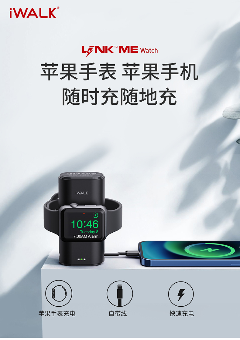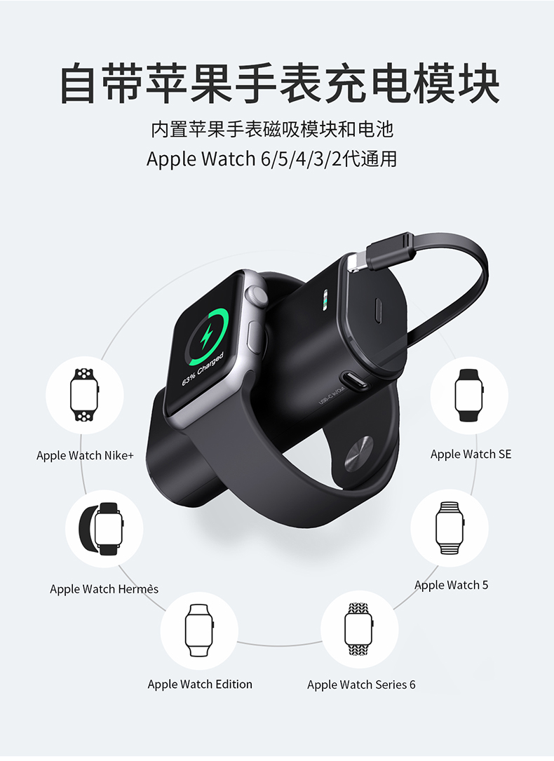 ・ 内置苹果手表磁吸模块和电池,自带苹果充电线。