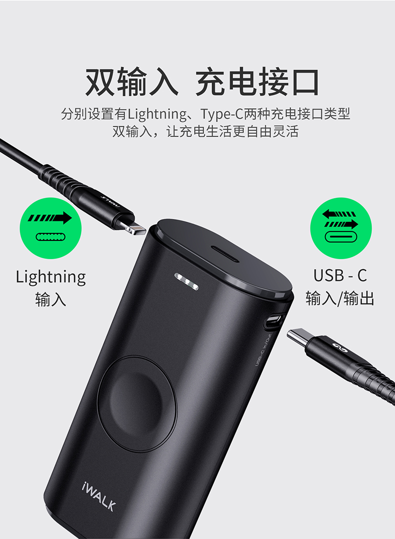 ・双输入,充电接口,可用苹果充电线跟TYPE-C线给它充电,让充电更加灵活